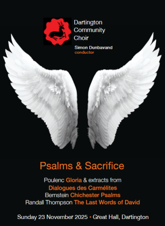 Dartington Community Choir’s Autumn concert, PSALMS & SACRIFICE combines dramatic contrasts of both passion and exhilaration in a concert not to be missed. This is a golden opportunity to hear three great composers of the 20th century: Poulenc, Leonard Bernstein and Randall Thompson in works which touch the very heart of what it is to be human. The choir, conducted by Simon Dunbavand will be supported by 2 soloists, Catherine Hamilton and Harriet Oakley and an orchestration of piano, Ian Curror, harp, Sally Jenkins and percussion, Michelle Hiley.