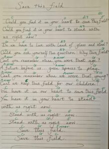 The plan is to record people singing the new song and share widely to raise awareness about the field and community feelings to save it, as evidenced by a large recent survey.